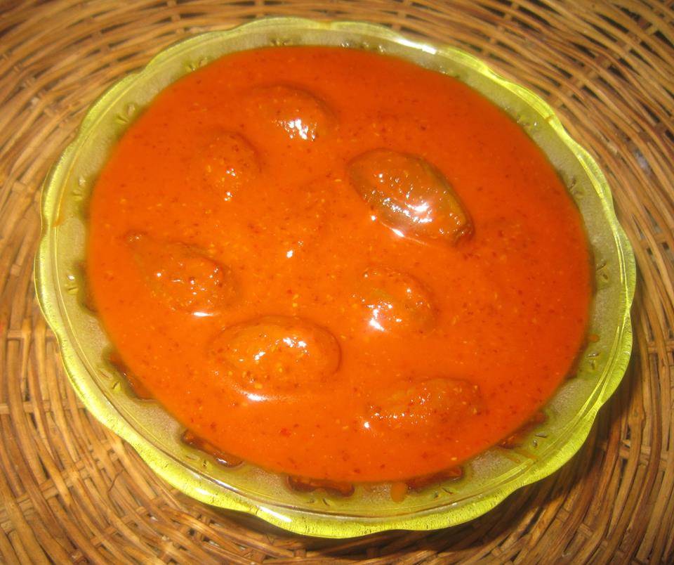 In a porcelain container add the sour hog plums , ground powder, mix well ..Now add the boiled cooled salt water little by little n mix thoroughly .